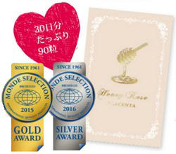 2015年モンドセレクション金賞を受賞した「ハニーローズプラセンタ」を、今なら、通常価格13,600円が無料でお試しいただけます。